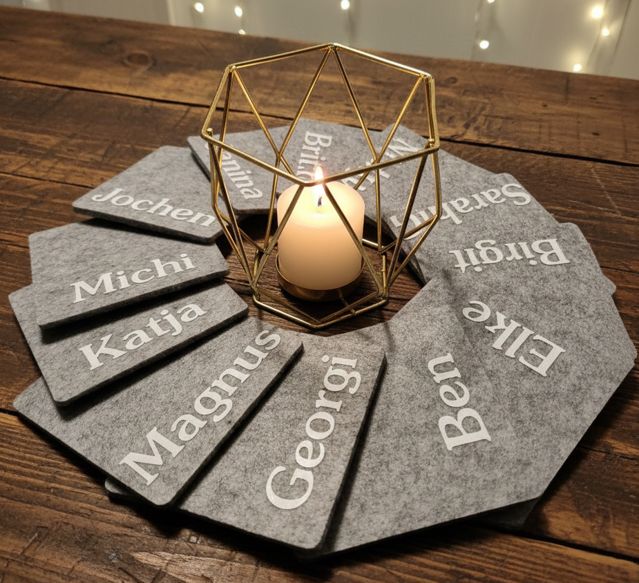 Erhältlich in elegantem Hell- oder Dunkelgrau, passen diese Untersetzer perfekt zu jedem Einrichtungsstil. Das Besondere: Sie können die Untersetzer individuell gestalten – ob mit einem einem Wunschnamen oder einem einzigartigen Design. So werden sie zu einem besonderen Blickfang und einem persönlichen Geschenk für Freunde und Familie.